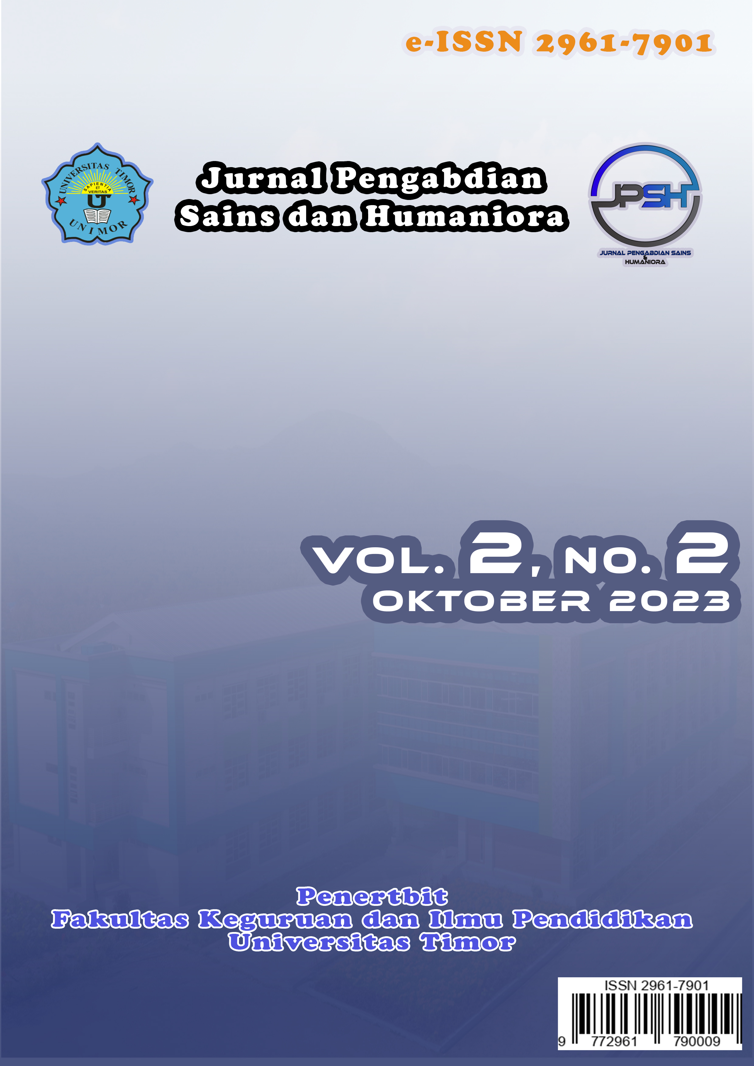 Vol. 2 No. 2 (2023)Jumlah artikel yang terbit pada Jurnal Pengabdian Sains dan Humaniora Volume 2 nomor 2, edisi Oktober 2023, terdiri dari 7 artikel, yang merupakan hasil ABDIMAS dari 33 penulis. Ke-33 penulis tersebut berasal dari 7 Perguruan Tinggi di Indonesia yaitu Universitas Pendidikan Indonesia, Universitas Kristen Indonesia, Universitas Suryakancana, Universitas Jenderal Sudirman, Universitas Muhammadiyah Sukabumi, Universitas Nusa Putra dan Universitas Timor.