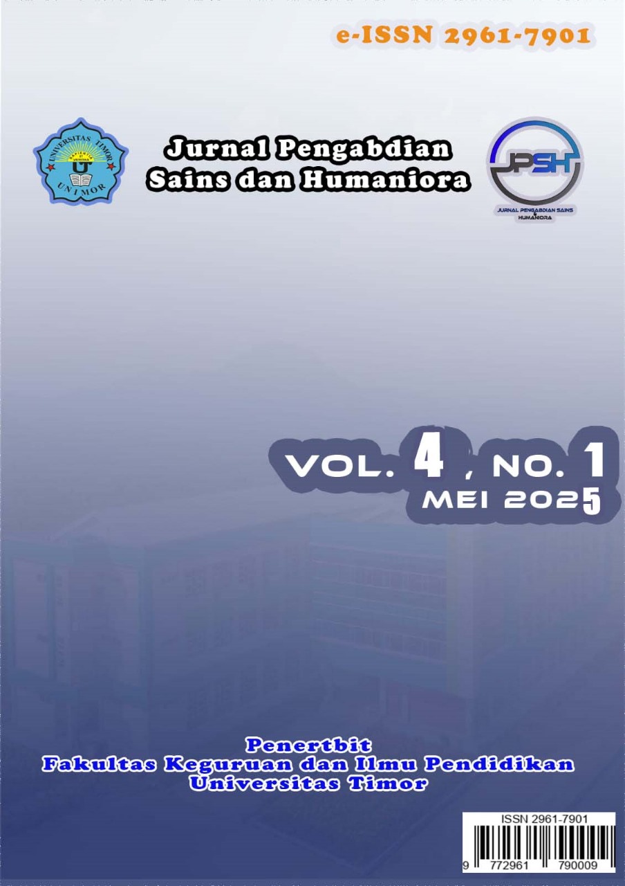 Vol. 2 No. 1 (2023)Jumlah artikel yang terbit pada Jurnal Pengabdian Sains dan Humaniora Volume 2 nomor 1, edisi Mei 2023, terdiri dari 8 artikel, yang merupakan hasil ABDIMAS dari 27 penulis. Ke-27 penulis tersebut berasal dari 4 Perguruan Tinggi dan 1 Sekolah Menengah Atas di Indonesia yaitu Universitas Pendidikan Indonesia, Universitas PGRI Argopuro Jember, Universitas Katolik Widya Mandira, Universitas Timor, dan SMA Negeri Noemuti Timur.